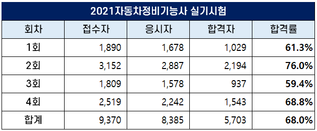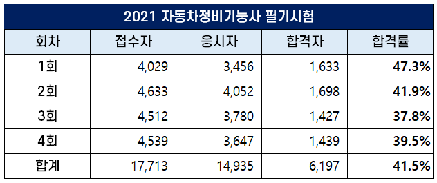 2022년 자동차정비기능사 1~4회 필기 및 실기 합격률