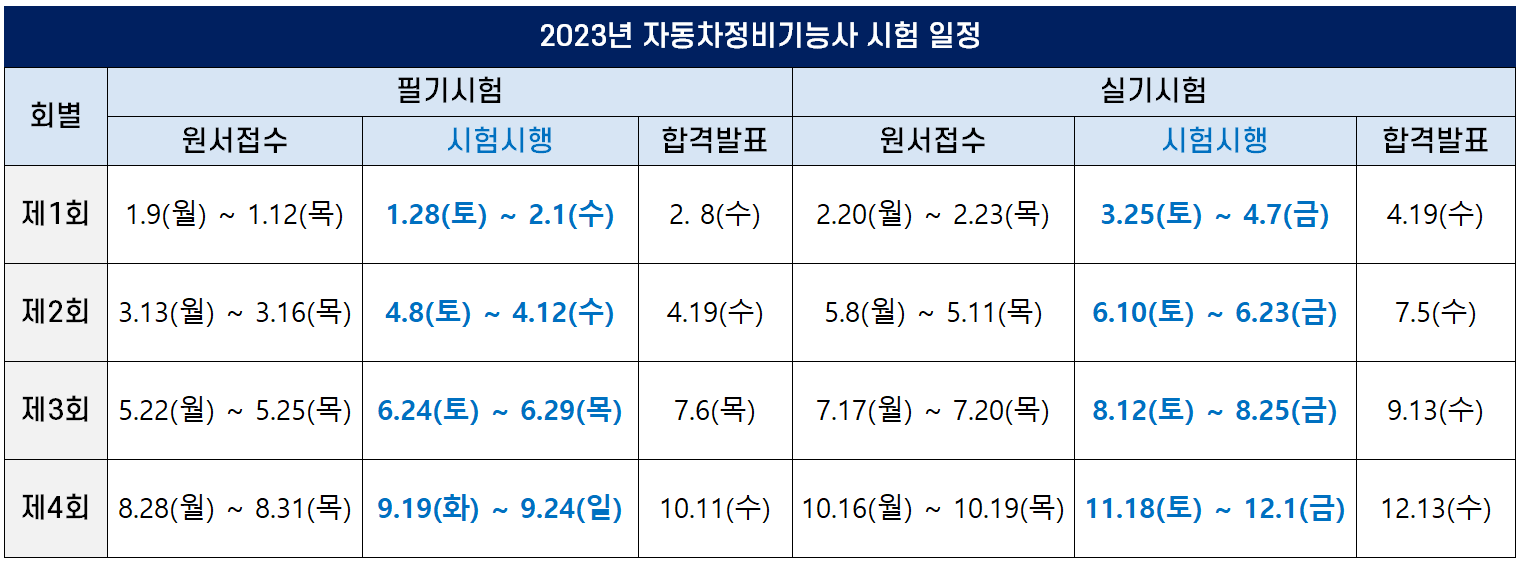 2023년 자동차정비기능사 1회~4회 시험일정은 아래 표로 정리했습니다(모바일 환경에서 표가 깨져보일 경우, 아래 그림으로 된 표를 보시기 바랍니다).
