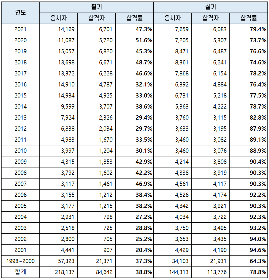 | 회차 | 접수자 | 응시자 | 합격자 | 합격률 |