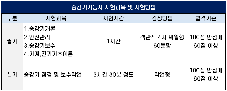 | 실기 | 승강기 점검 및 보수작업 | 3시간 30분 정도 | 작업형 | 100점 만점에 60점 이상 |