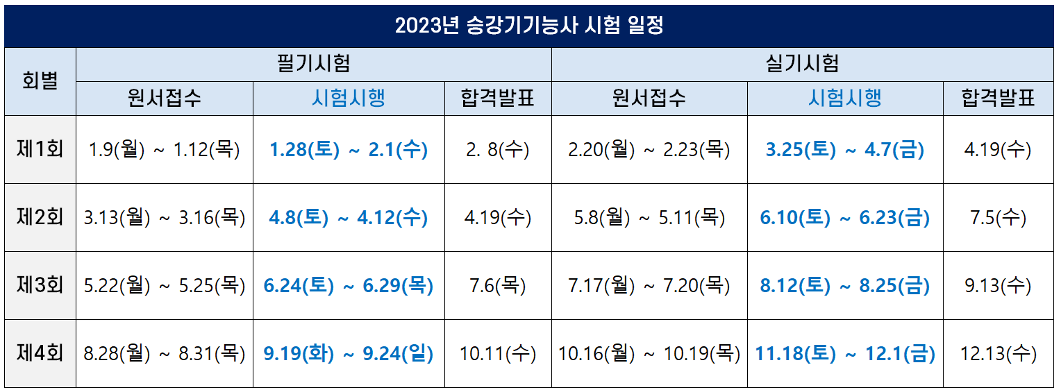 2023년 승강기기능사 1회~4회 시험일정은 아래 표로 정리했습니다(모바일 환경에서 표가 깨져보일 경우, 아래 그림으로 된 표를 보시기 바랍니다).