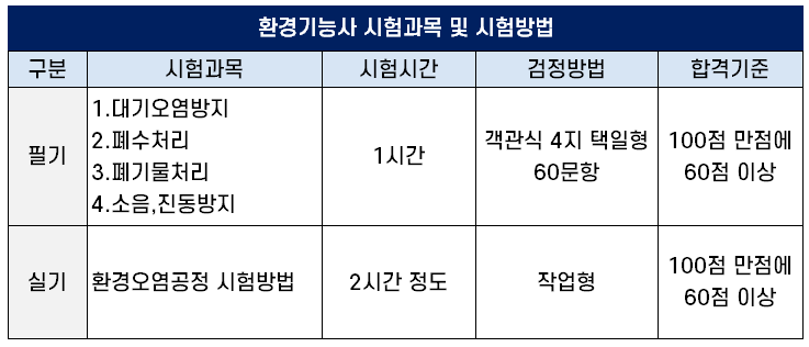| 실기 | 환경오염공정 시험방법 | 2시간 정도 | 작업형 | 100점 만점에 60점 이상 |