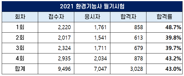 2022년 환경기능사 합격률 환경기능사는 매년 4회의 필기시험과 실기시험을 시행하고 있는데요. 한국산업인력공단이 시행하는 정기 기능사 1회, 2회, 3회, 4회 시험 일정에 따라 시험이 실시됩니