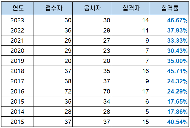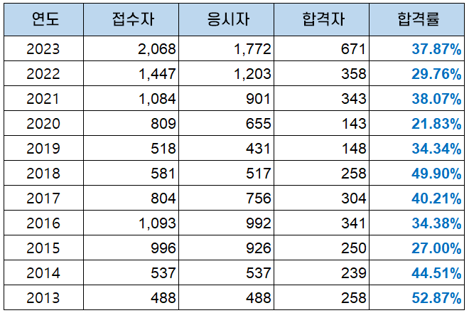 | 연도 | 접수자 | 응시자 | 합격자 | 합격률 |