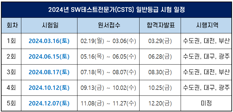 | 2024년 SW테스트전문가(CSTS) 일반등급 시험 일정 | ||||