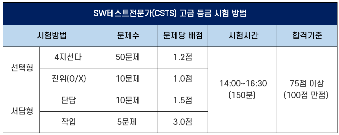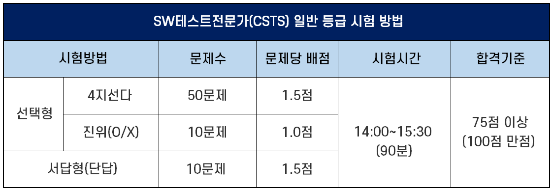 - CSTS 일반 등급(Foundation Level): 소프트웨어 테스트에 대한 기술이론 지식을 갖추고, 테스트 계획, 설계, 실행, 종료 등 테스트 프로세스를 이해하며 테스트 케이스를 설계할 수 있는 능력의 유무