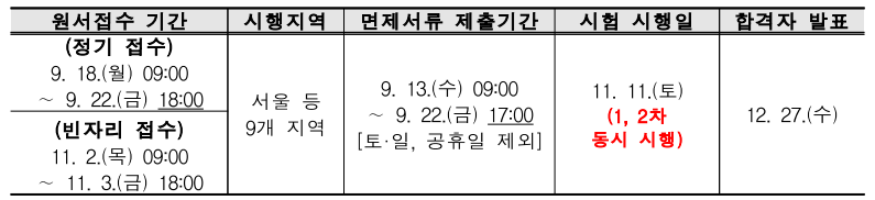 2022년제24회 시험부터 1차 시험과 2차 시험 사이 휴식시간이 10분에서 20분으로 변경되어 2차 시험 시작 시간이 11시 30분에서 11시 40분으로 변경되었습니다.