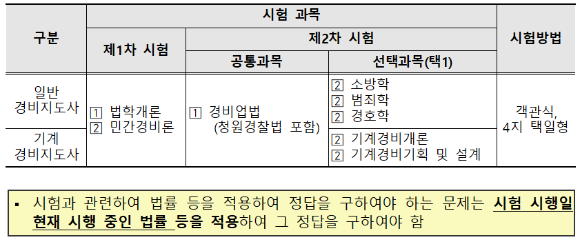 ※「경비업법 시행령」 제12조 제5항에 따라 제1차 시험에 불합격한 자가 치른 제2차 시험은 무효로 함(전년도 제1차 시험 합격자가 금년도 제1차 시험에 재응시하는 경우 전년도 제1차 시험 합격은 무효로 하고 금년도 1차 시험 결과에 따라 합격 여부 결정)