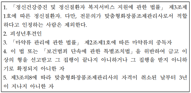 화장품법 제3조의5(맞춤형화장품조제관리사의 결격사유) 다음 각 호의 어느 하나에 해당하는 자는 맞춤형화장품조제관리사가 될 수 없다.