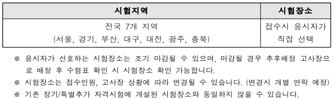※ 2023년 시험장소는 서울, 경기, 부산, 대구, 대전, 광주, 충북의 7개 지역이며 원서접수 시 응시자가 직접 시험장소를 선택할 수 있습니다.