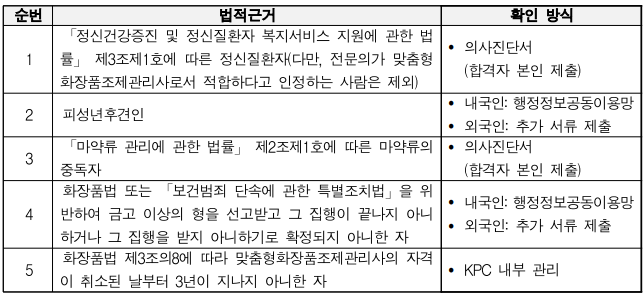 2022년 2월 18일부터 시행되는 화장품법 개정안에 따라 맞춤형화장품제조관리사 자격시험 합격자를 대상으로 결격사유 확인 절차를 적용합니다.