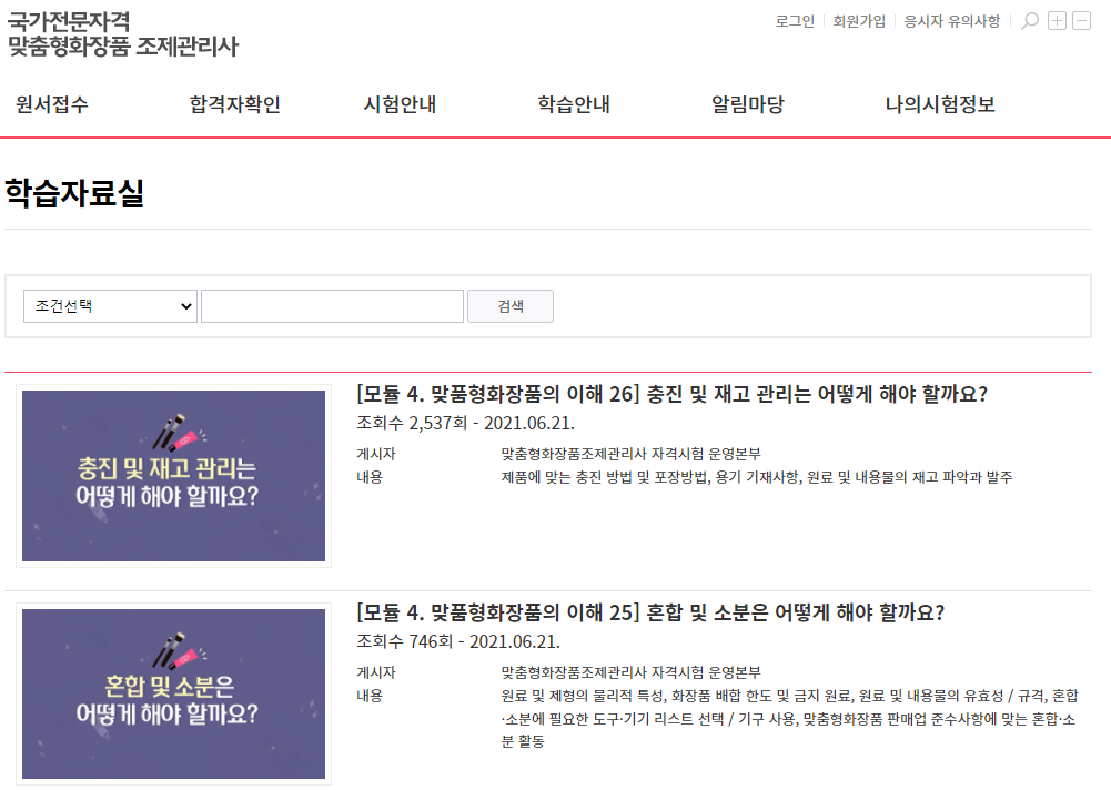 맞춤형화장품조제관리사 자격시험 홈페이지 학습자료실에서 볼 수 있는 온라인 강의를 적극 활용하시기 바랍니다.