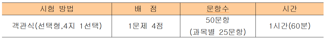○ 합격자 결정 : 매과목을 100점 만점으로 하여 매과목 40점 이상, 전과목 평균 70점 이상 득점한 사람