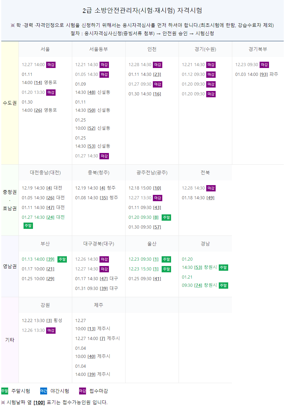 상세한 시험 일정은 한국소방안전원사이트 내 소방안전교육>시험접수>2급소방안전관리자 시험일정에서 아래와 같이 확인 가능합니다.