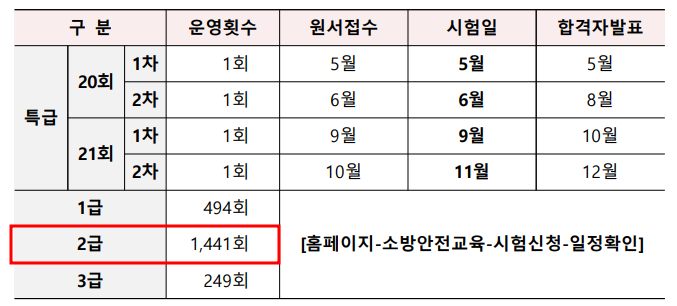 전국에 있는 한국소방안전원 15개 시·도지부 교육장 또는 지정 장소에서 시험을 시행하는 2급 소방안전관리자 자격시험은 연중 수시로 시험이 시행되는데요. 2024년에는 총 1,441회 시험이 시행될 예정입니다.