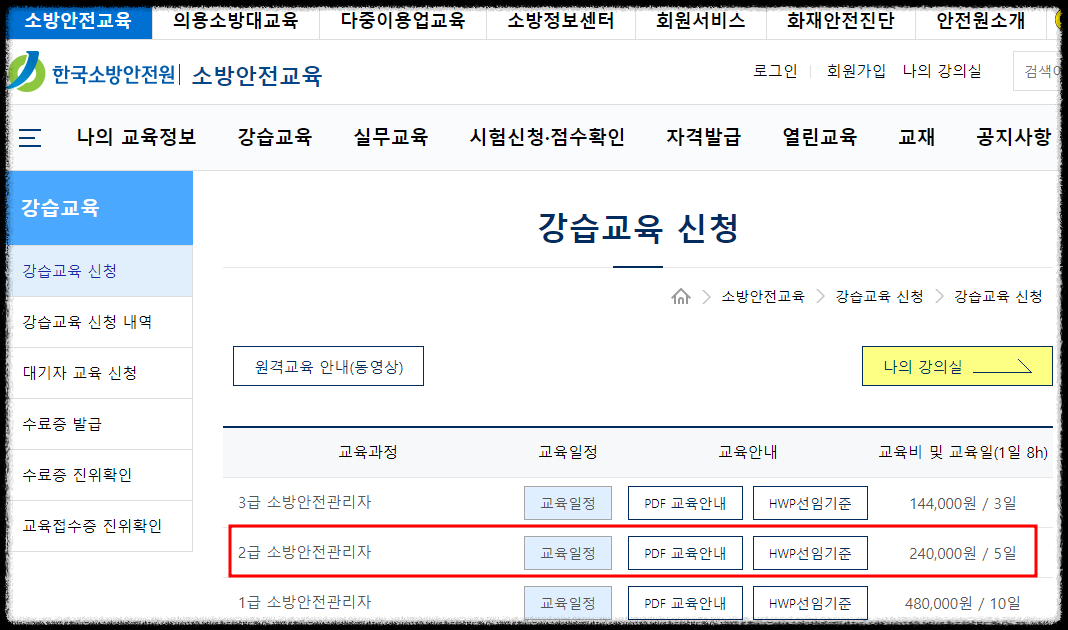 2급 소방안전관리자 강습교육 비용은 240,000원이며, 교육기간은 5일(40시간)입니다.