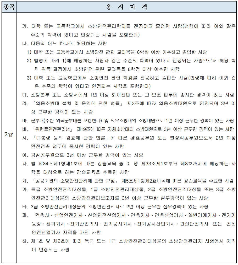 2급 소방안전관리자 선임기준 4번째 요건인 자격시험에 응시하기 위해서는 소방안전 관련 학력, 경력 등 아래 응시자격 가~ 하 중 어느 하나의 요건을 갖추어야 합니다(화재예방법 시행령 제31조 별표6).