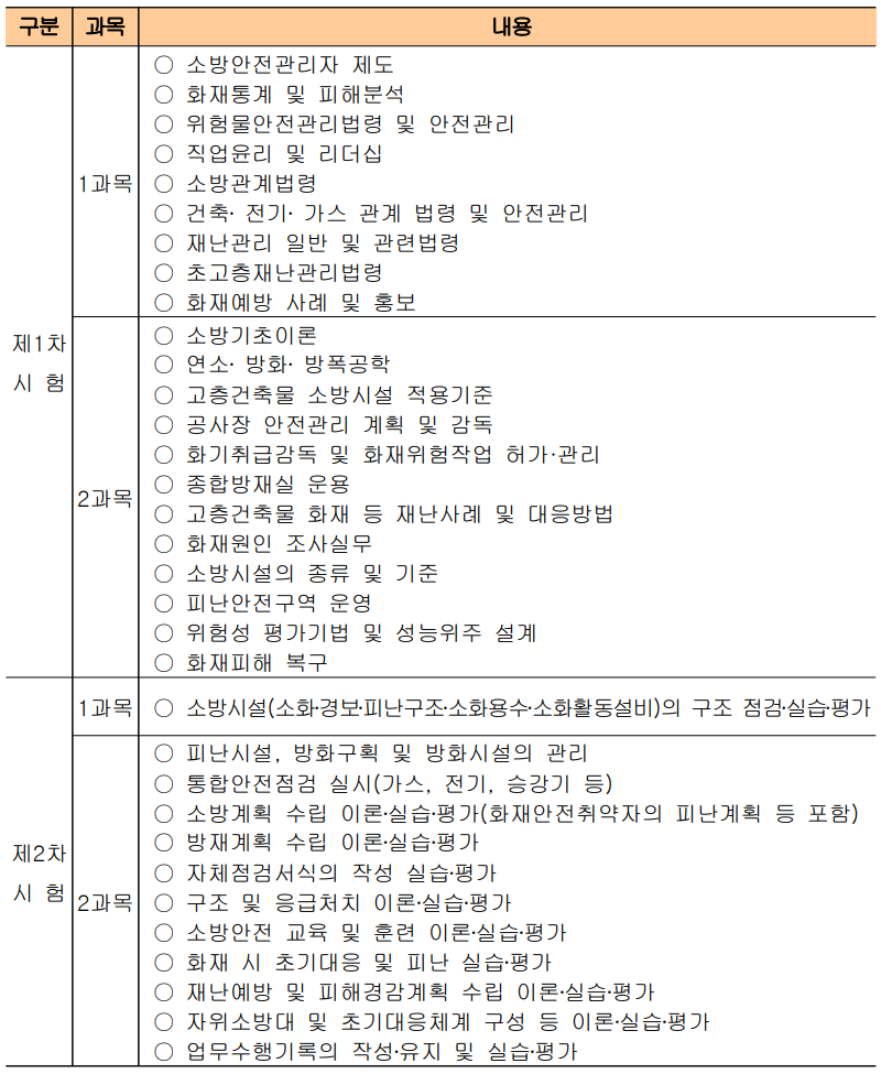| 2과목 | ○ 소방기초이론 ○ 연소․ 방화․ 방폭공학 ○ 고층건축물 소방시설 적용기준 ○ 공사장 안전관리 계획 및 감독 ○ 화기취급감독 및 화재위험작업 허가·관리 ○ 종합방재실 운용 ○ 고층건축물 화재 등 재난사례 및 대응방법 ○ 화재원인 조사실무 ○ 소방시설의 종류 및 기준 ○ 피난안전구역 운영 ○ 위험성 평가기법 및 성능위주 설계 ○ 화재피해 복구 |