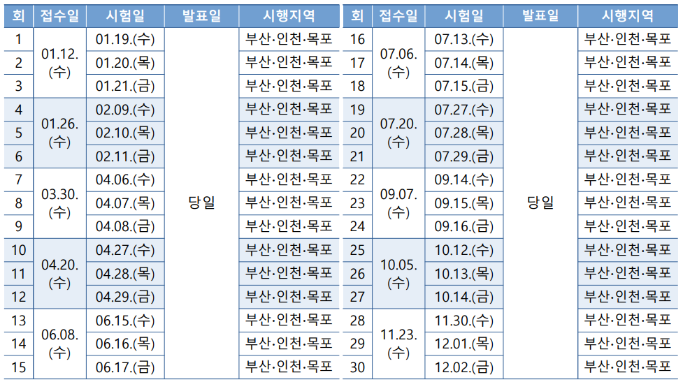 | 회 | 접수일 | 시험일 | 발표일 | 시행지역 |