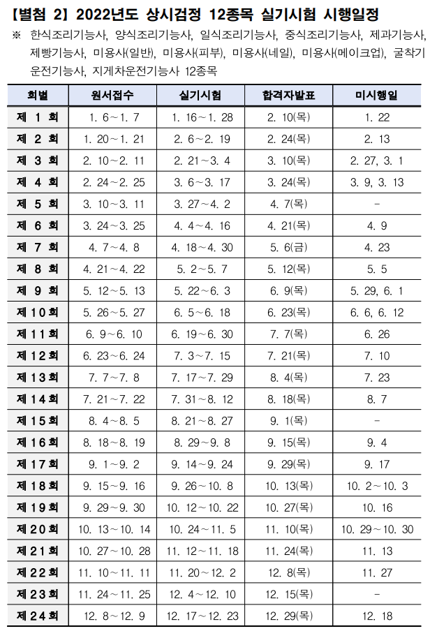 ※ 한식조리기능사, 양식조리기능사, 일식조리기능사, 중식조리기능사, 제과기능사, 제빵기능사, 미용사(일반), 미용사(피부), 미용사(네일), 미용사(메이크업), 굴착기운전기능사, 지게차운전기능사 12종목
