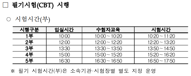 ※ 필기 시험시간(부)은 소속기관·시험장별 별도 지정 운영