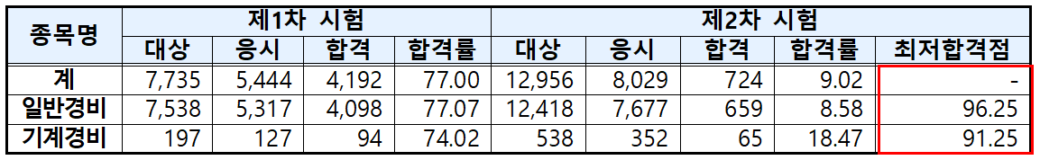 기계경비지도사의 커트라인은 91.25점으로 지난해 커트라인이었던 85점에 비해 6.3점이 상승했습니다.