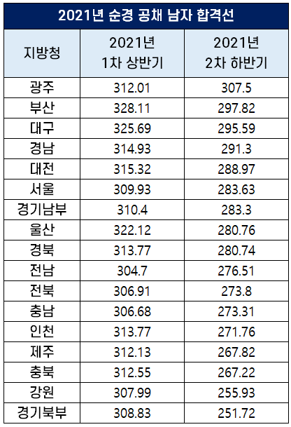2021년 상반기 1차 순경 공채 남자 커트라인은 부산 지방경찰청이 328.11점으로 가장 높았고, 전남 지방경찰청이 304.7점으로 가장 낮았습니다.