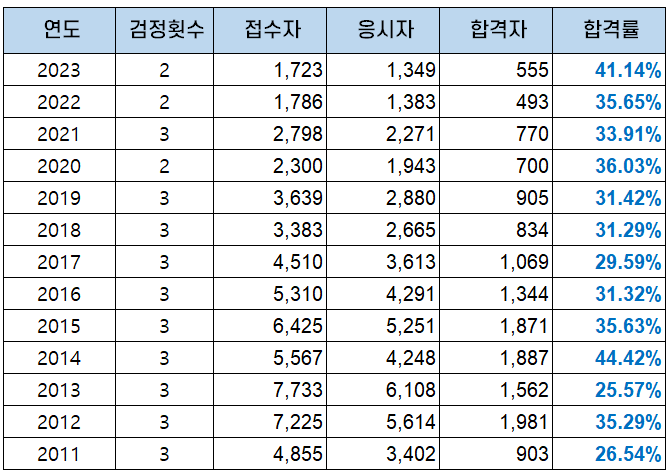 2022년에는 1,383명의 응시자 중 493명이 합격해 35.65%의 합격률을 보였고, 2023년에는 1,349명의 응시자 중 555명이 합격해 41.14%의 합격률을 기록했습니다.