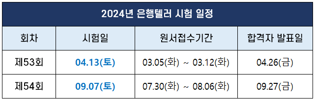 2024년 은행텔러 시험 일정은 아래 표와 같습니다.