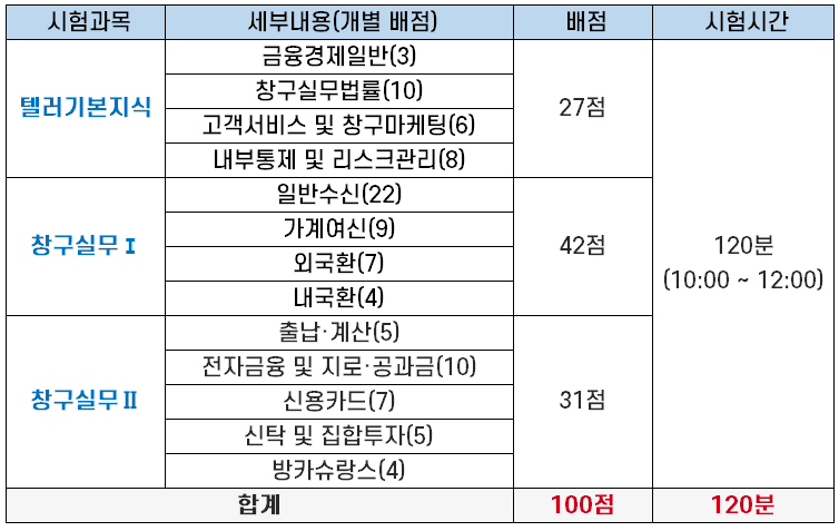 | 텔러기본지식 | 금융경제일반(3) | 27점 | 120분 (10:00~12:00) |