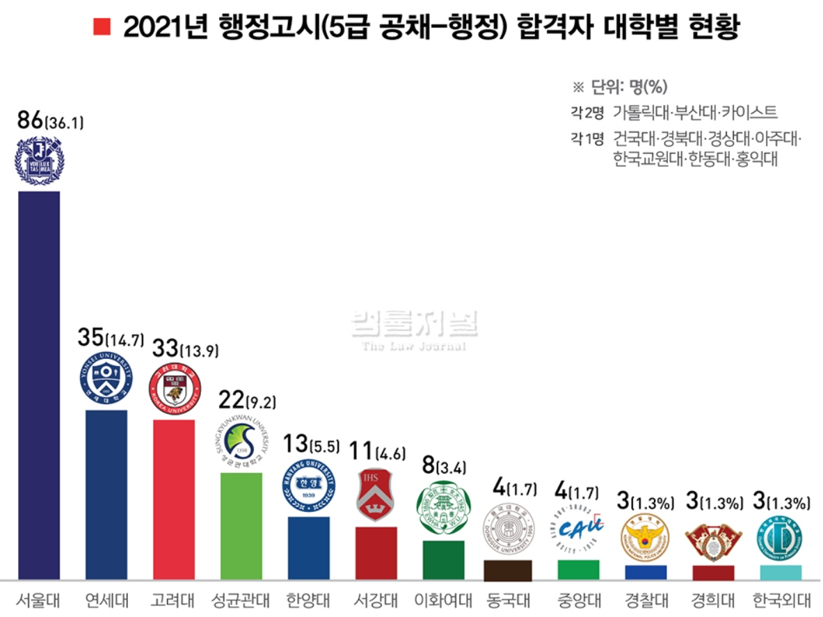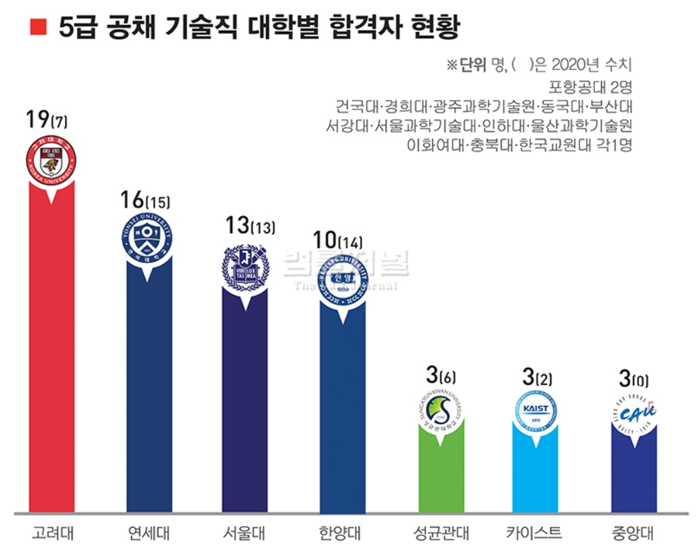 2021년 5급 공채 기술직 최종 합격자는 81명인데요. 법률저널의 설문조사에 따르면 합격자 81명 중 19명이 고려대 출신으로 압도적인 1위에 올랐습니다.