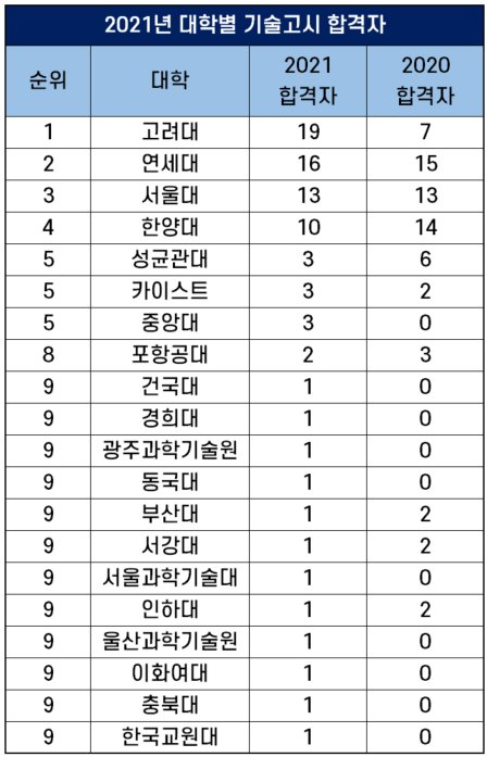 2021년 대학별 기술고시 합격자 현황 및 순위