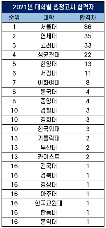 2021년 대학별 행정고시 합격자 순위 4~6위는 서성한이 차지했는데요.