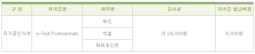 e-Test Professionals 시험과목은 워드, 엑셀, 파워포인트 3과목이며, 각 과목마다 50분 동안 실기 시험을 시행하는데요. 워드, 엑셀, 파워포인트 개별 과목마다 시험 응시가 가능하며 과목별 시험 응시료는 24,000원입니다. 3과목을 한꺼번에 응시하는 e-Test Professionals 통합 시험의 응시료는 72,000원입니다.