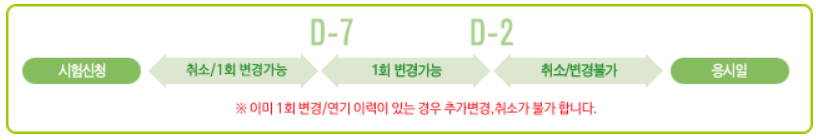 ※ 시험 취소는 접수 마감일까지 가능하며 시험 연기는 시험일 기준 2일전까지 최초 1회만 가능하고, 1회 연기 후 추가 연기는 불가능합니다.