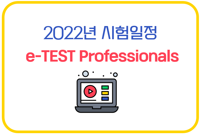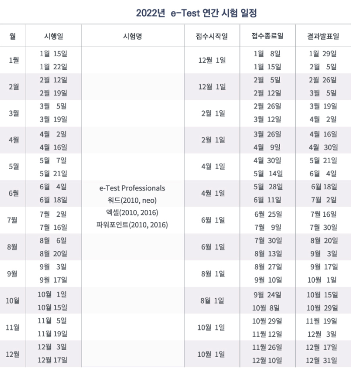 e-Test Professionals 시험은 매월 2회, 1년에 총 24회 시험을 시행하는데요. 2022년 e-Test 시험 일정은 다음과 같습니다.