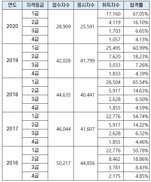| 연도 | 자격등급 | 접수자수 | 응시자수 | 취득자수 | 합격률 |