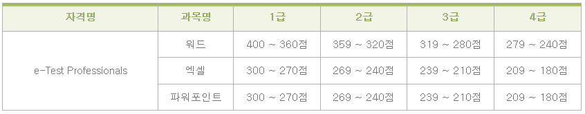 워드는 400점 만점, 엑셀과 파워포인트는 300점 만점을 기준으로 채점하며, 아래 표와 같이 응시자의 취득 점수에 따라 1~4급으로 자격 등급을 구분합니다.