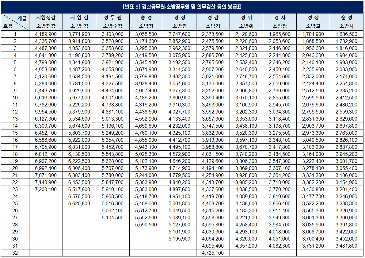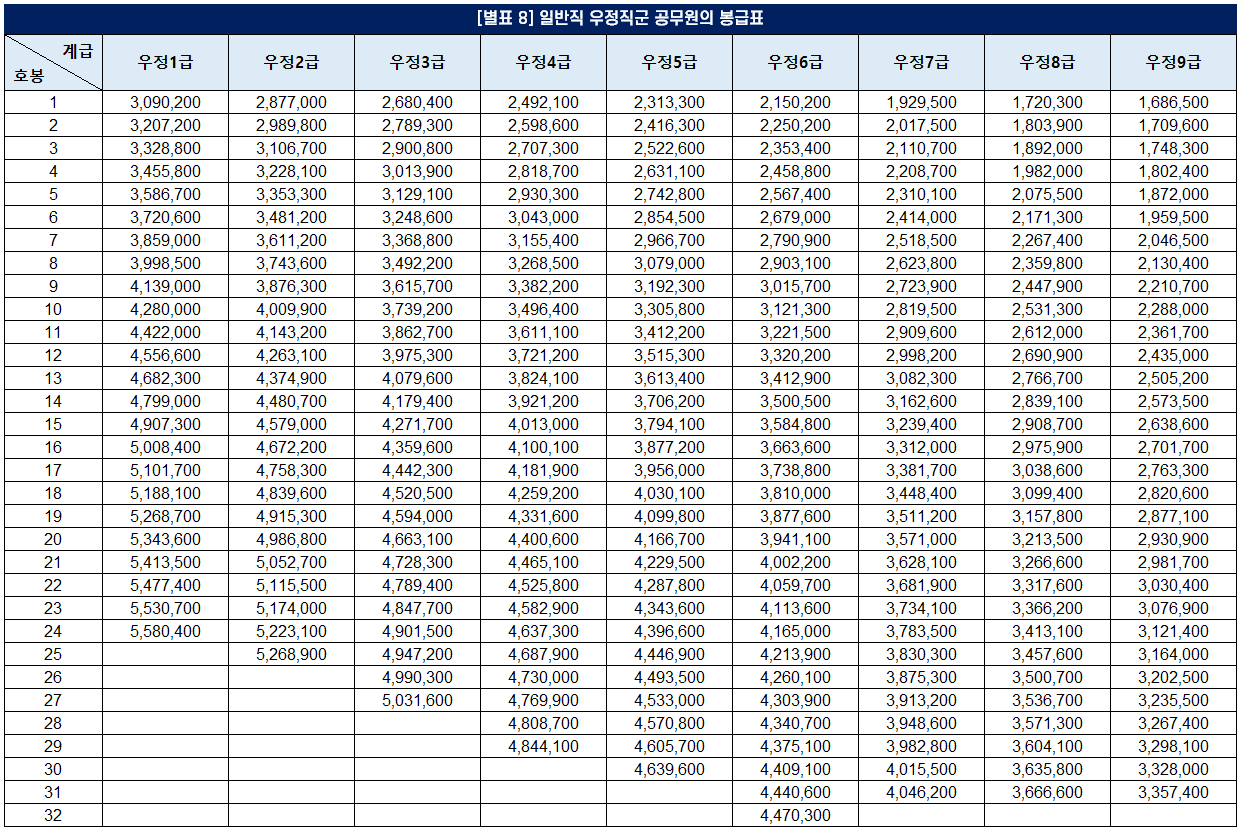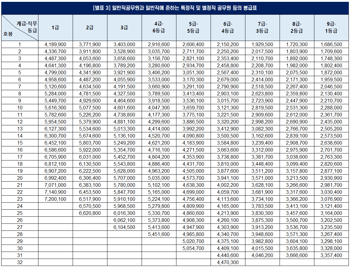 공무원보수규정 [별표3] 일반직공무원과 일반직에 준하는 특정직 및 별정직 공무원 등의 봉급표는 다른 공무원 봉급표가 적용되지 않는 대부분의 국가직 일반공무원과 지방직 일반공무원 및 일반군무원에게 적용되는 봉급표입니다.