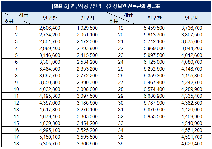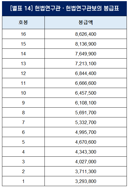 공무원보수규정 [별표14] 헌법연구관ㆍ헌법연구관보의 봉급표는 헌법재판소의 헌법연구관 및 헌법연구관보에게 적용되는 봉급표입니다.