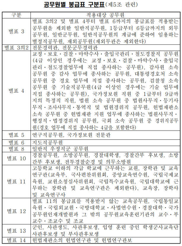 적용대상: 별표 3의2 및 별표 4부터 별표 6까지의 봉급표를 적용받는 공무원을 제외한 일반직공무원, 1등급부터 6등급까지의 외무공무원, 일반군무원, 일반직공무원의 계급에 준하여 임용하는 별정직공무원, 재외공무원(재외무관은 제외한다)