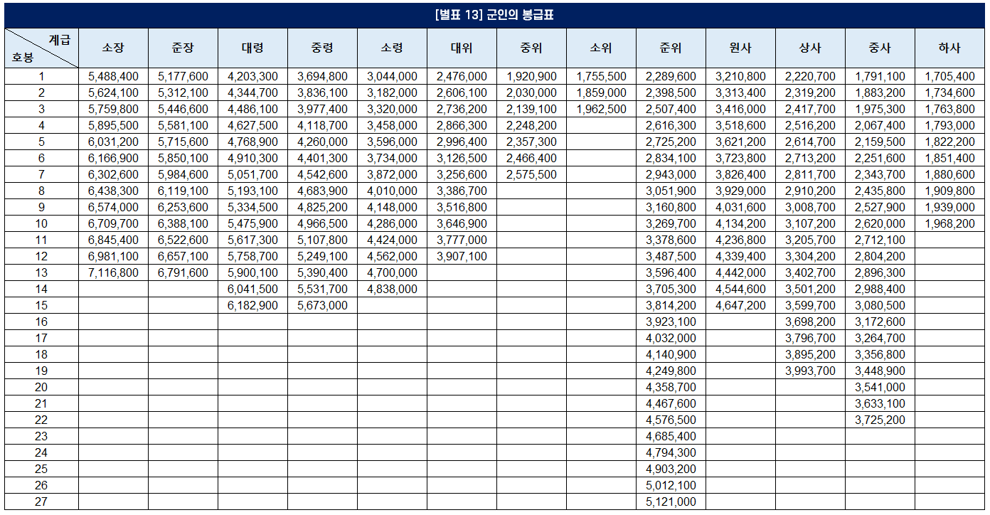 ◎ 병: 이등병 510,100원, 일등병 552,100원, 상등병 610,200원, 병장 676,100원