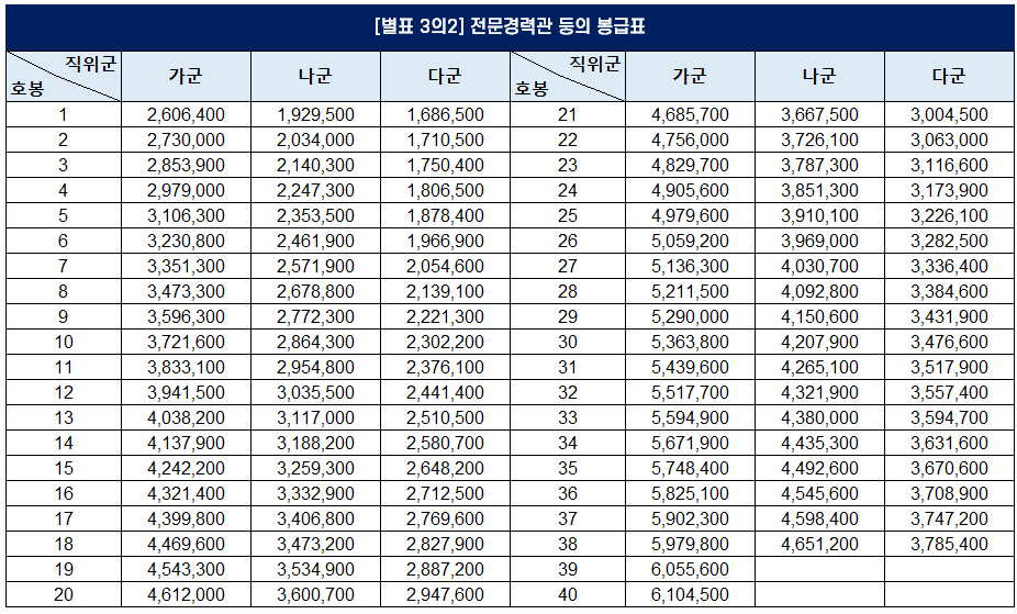 공무원보수규정 [별표3의2] 전문경력관 등의 봉급표는 전문경력관과 전문군무경력관에게 적용되는 봉급표입니다.