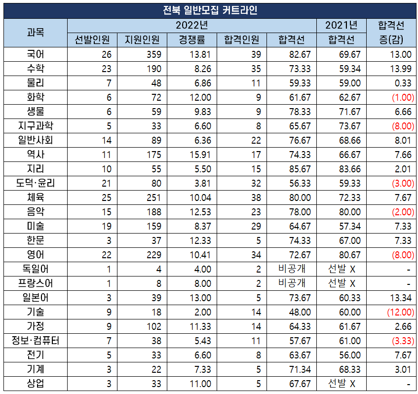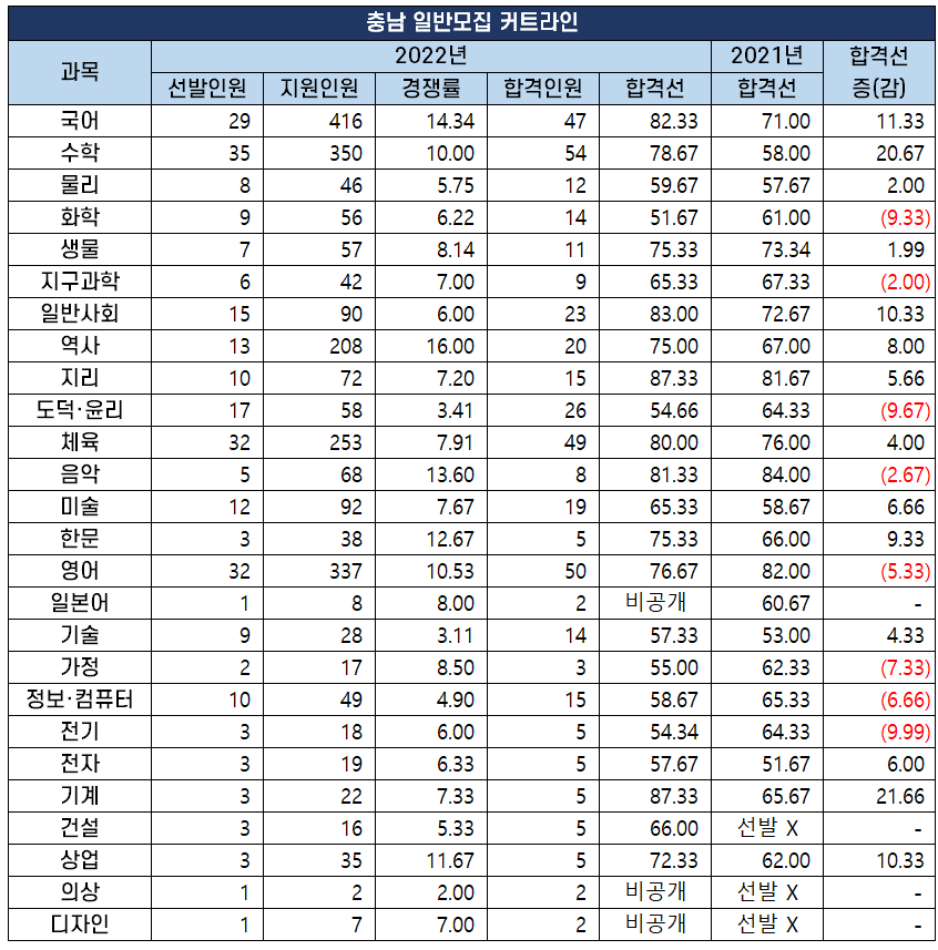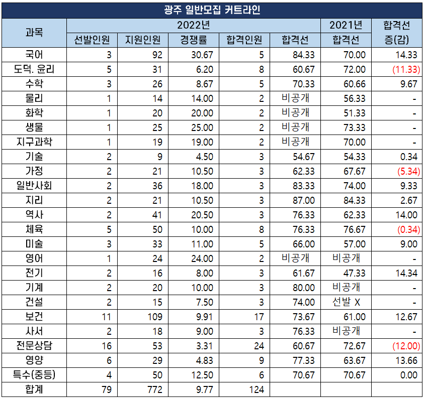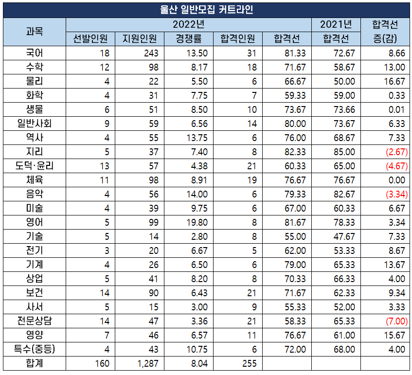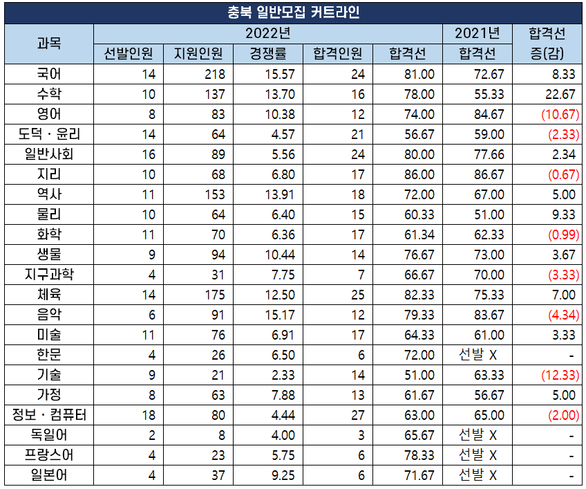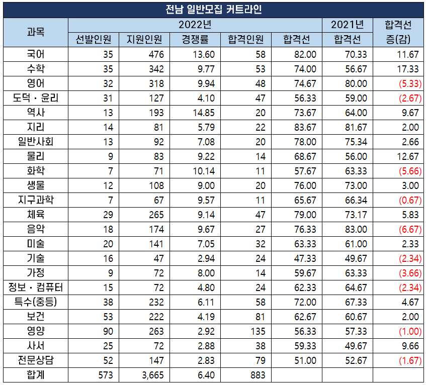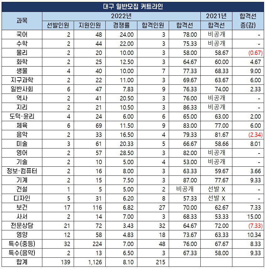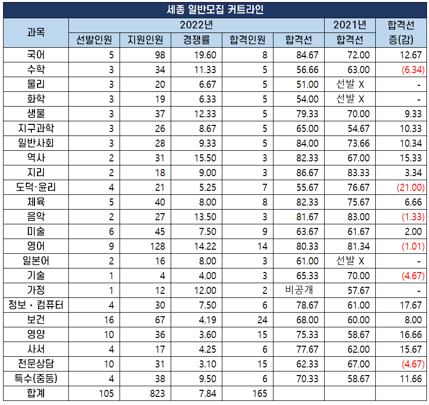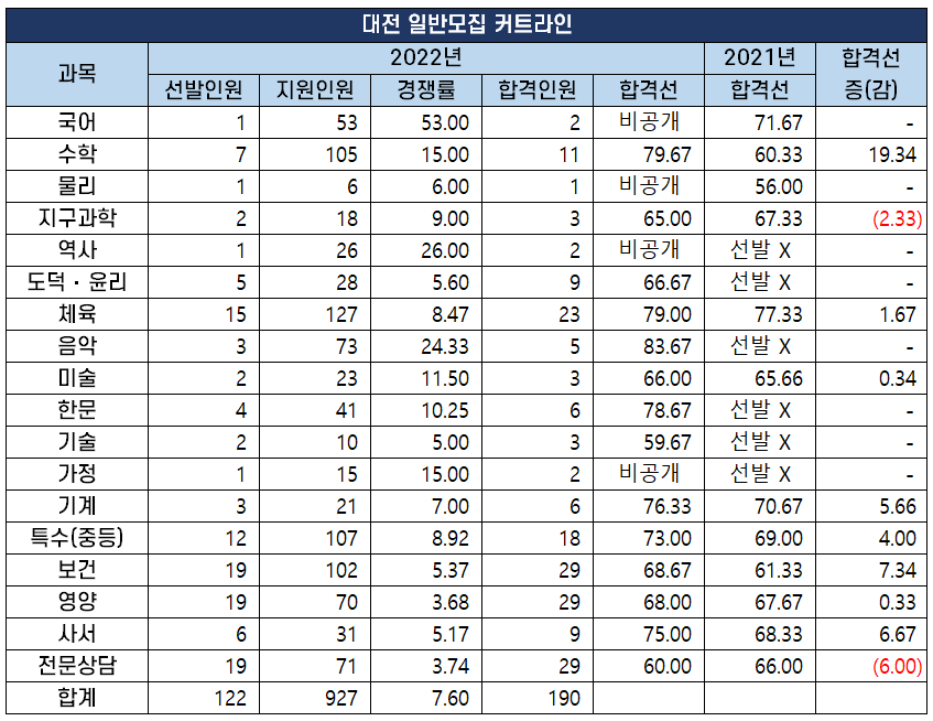 2022년 중등 임용 고시 과목별 최종 커트라인(합격선) 분석