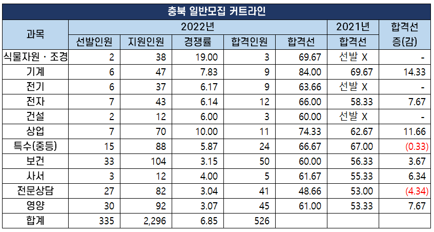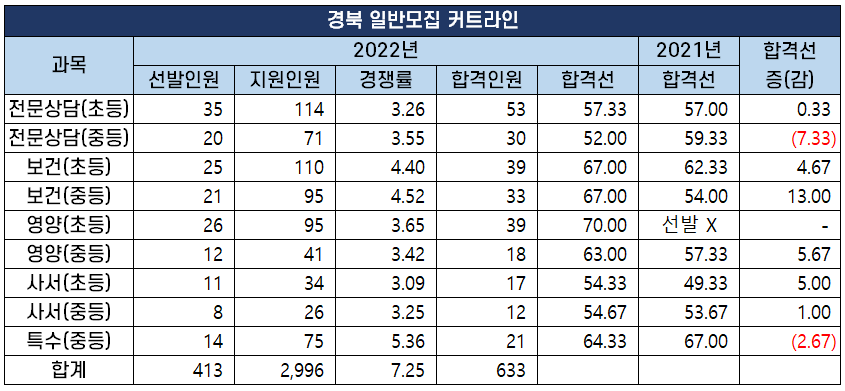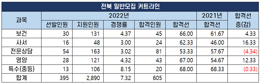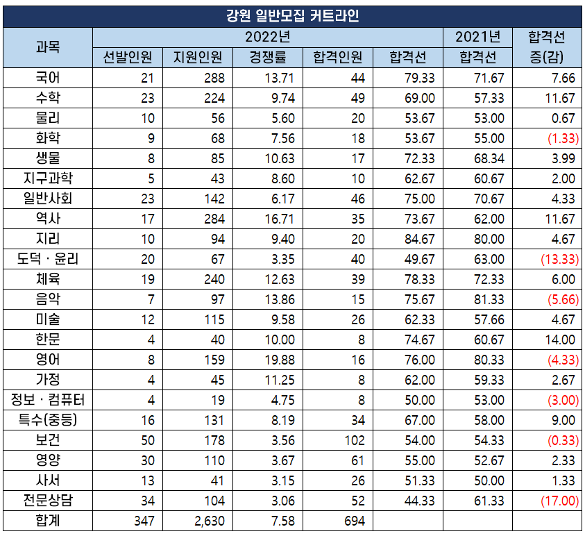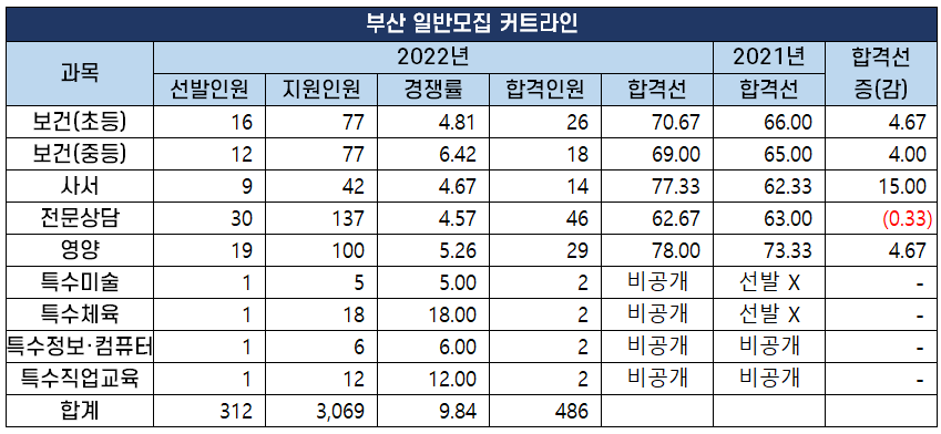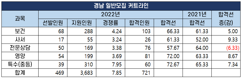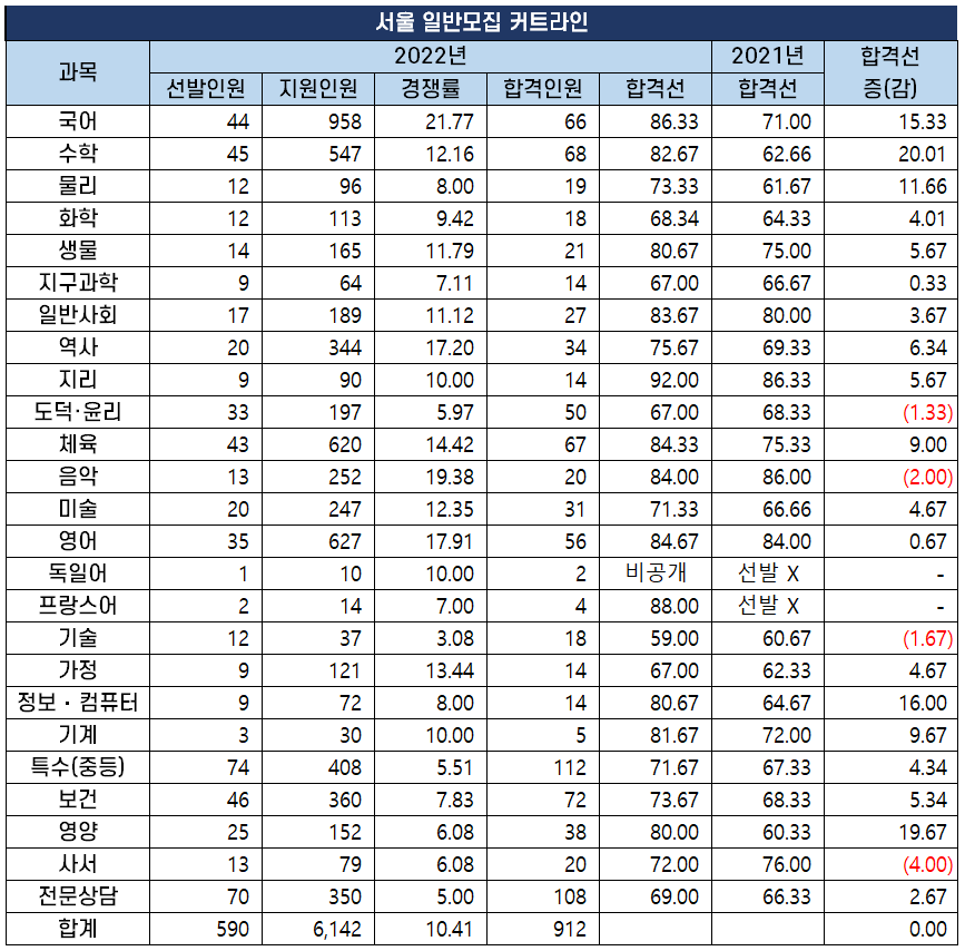 2022년도 중등임용고시 최종 커트라인 과목별 비교 분석 2022년 2월 10일 전국 17개 시도 교육청에서 시행하는 2022년도 공립 중등학교 교사, 특수(중등), 보건, 영양, 사서, 전문상담교사 임용 시험의