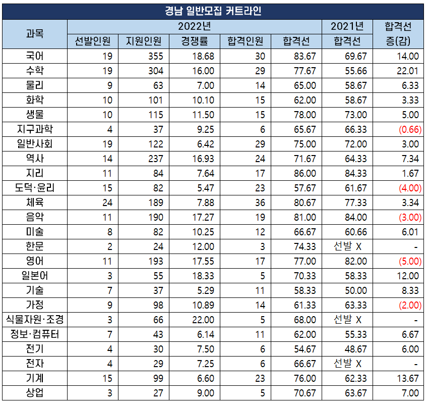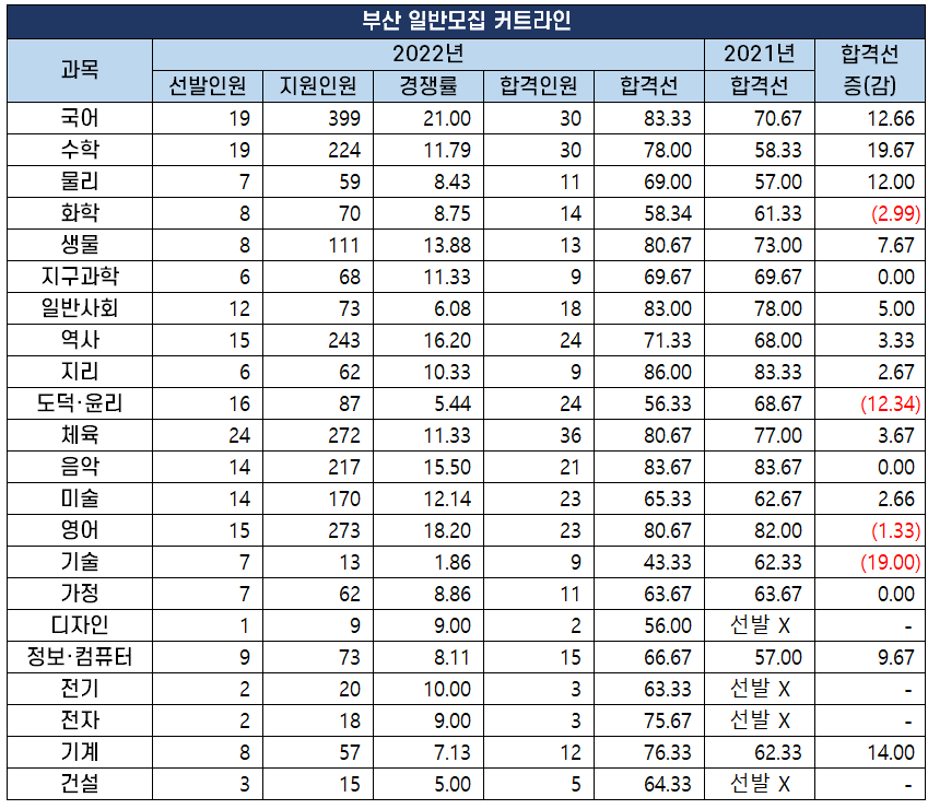 | 과목 | 2022년 | 2021년 | 합격선 증(감) |