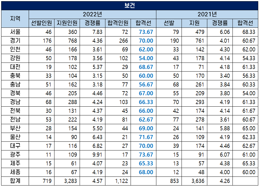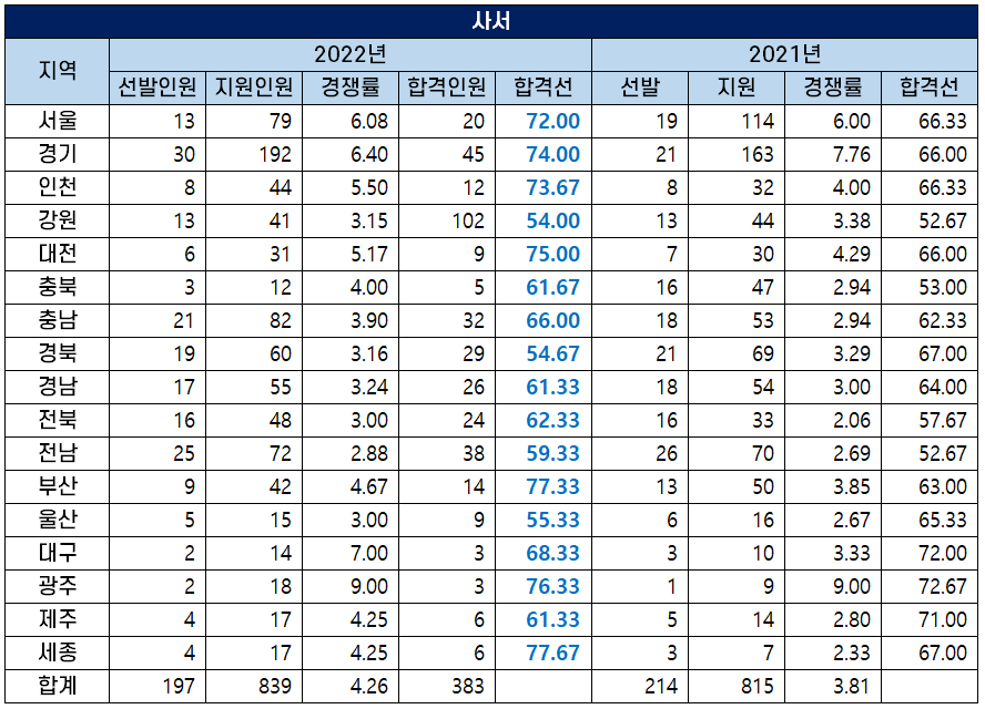2022년도 중등임용고시 최종 커트라인 과목별 비교 분석 2022년 2월 10일 전국 17개 시도 교육청에서 시행하는 2022년도 공립 중등학교 교사, 특수(중등), 보건, 영양, 사서, 전문상담교사 임용 시험의