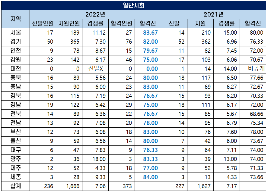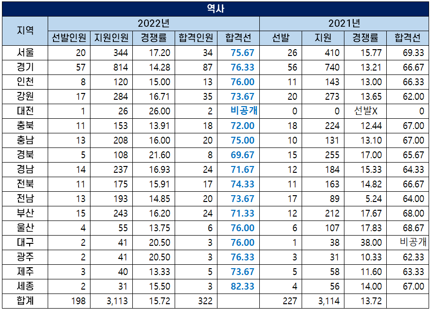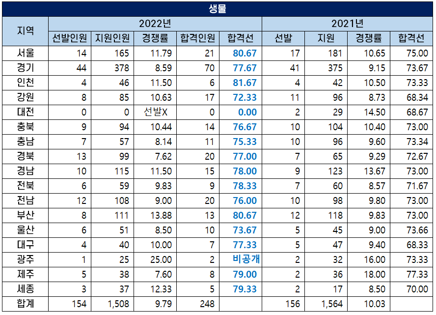 이번 포스팅에서는 전국 17개 지역의 중등임용고시 일반 모집 1차 합격선을 과목별로 비교 분석했는데요. 2022년 지역별 및 과목별 중등임용고시 최종 합격자 현황 및 커트라인은 하단에 링크를 첨부한 포스팅을 보시기 바랍니다.