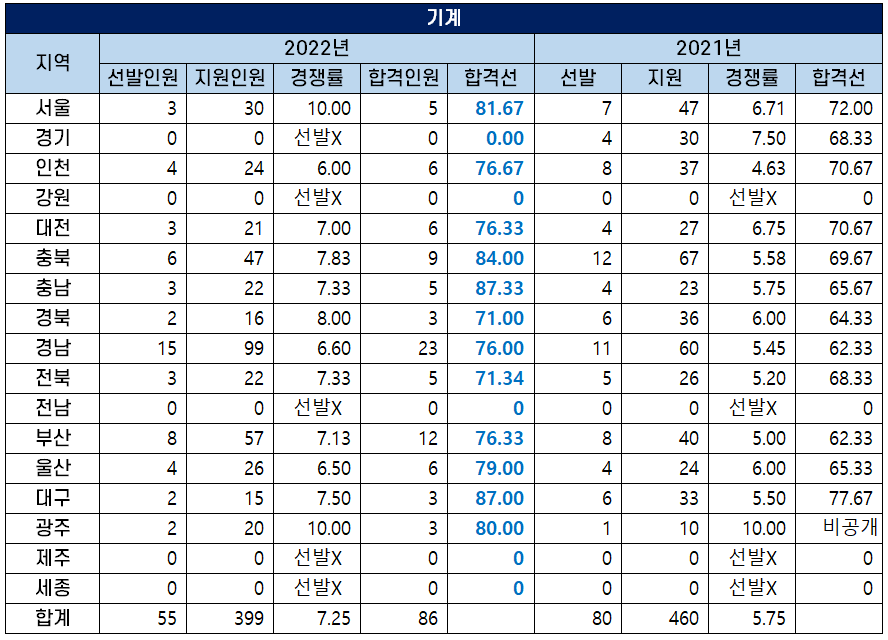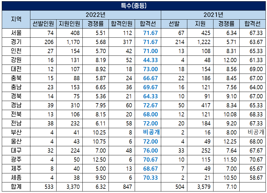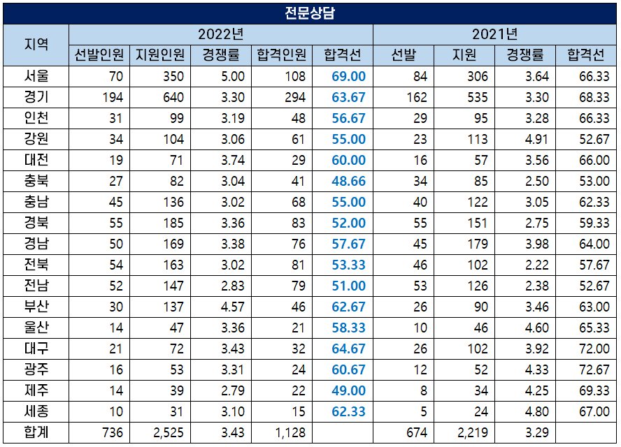 2022년도 전문상담 교사 1차 시험 합격선은 2021년보다 상승한 지역이 많은데요. 아래 표에서 부산 지역은 선발 인원 및 합격인원은 특수미술, 특수체육, 특수정보컴퓨터, 특수직업교육 교사 인원을 합한 것입니다.