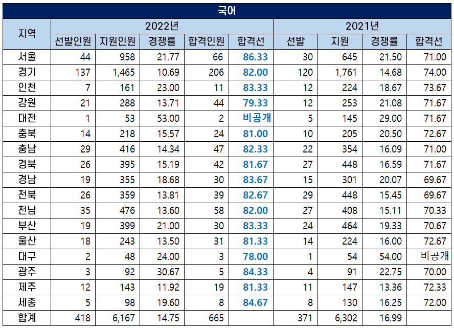 2022년도 중등임용고시 국어 과목 1차 시험 합격선은 2021년보다 크게 상승했는데요. 가장 높은 커트라인을 기록한 서울시의 합격선은 86.33점으로 지난해보다 커트라인이 15.33점 상승했습니다.